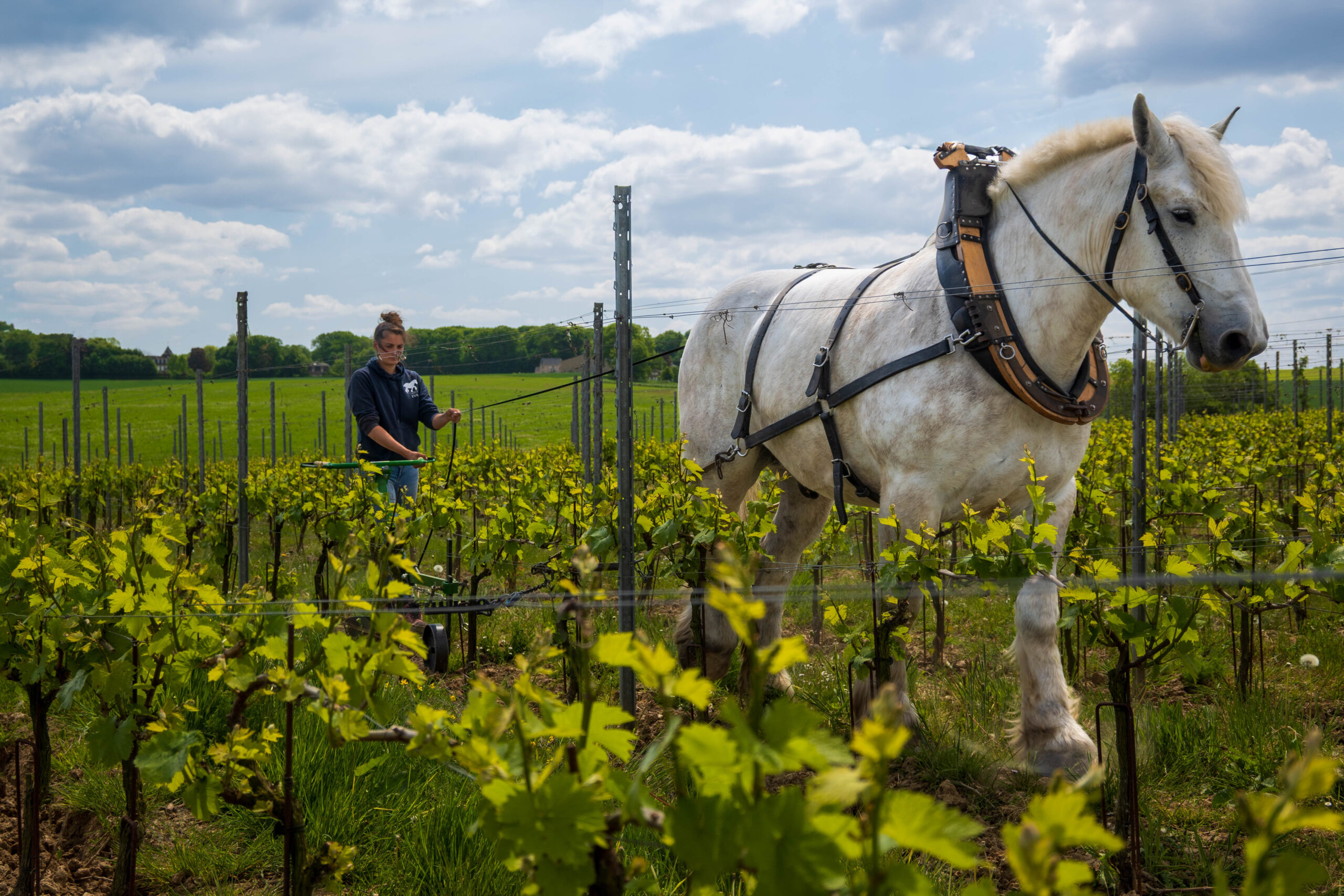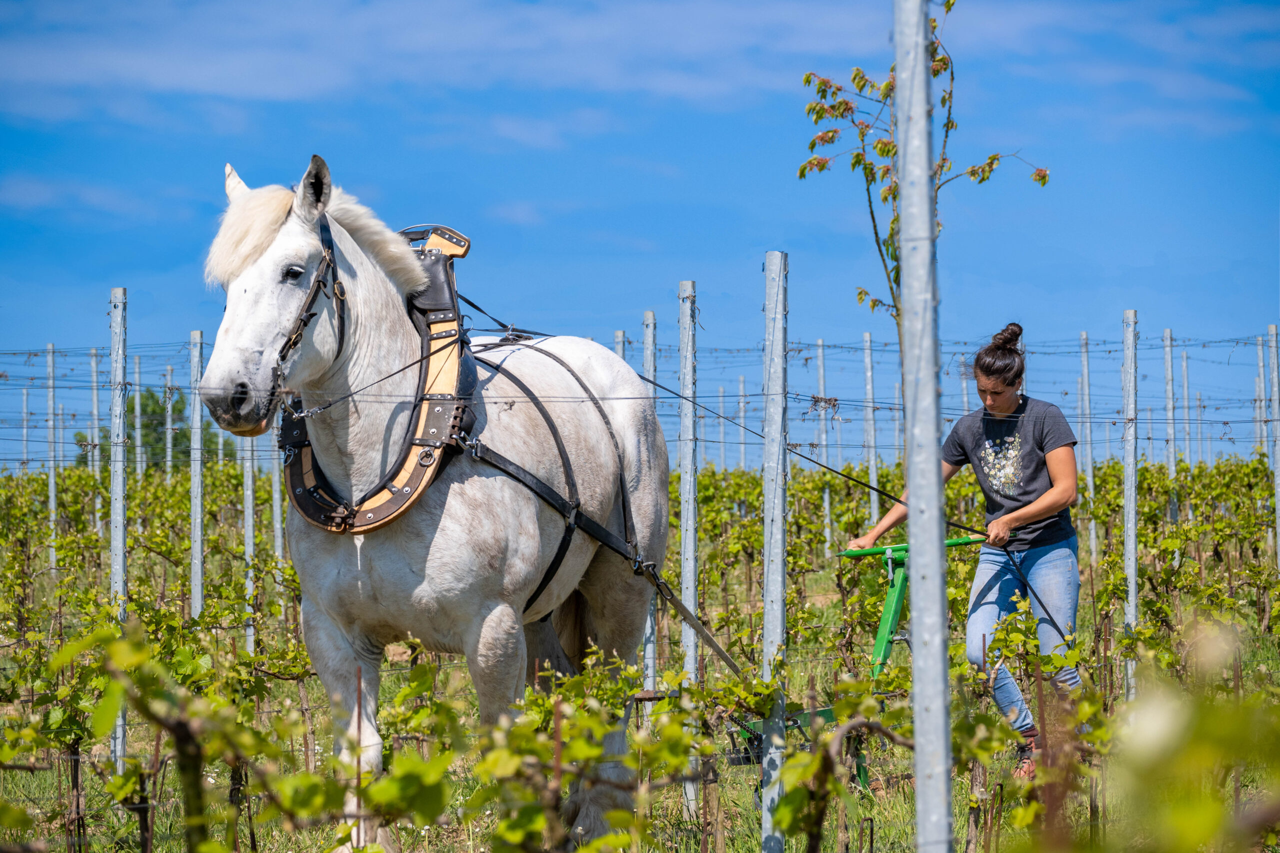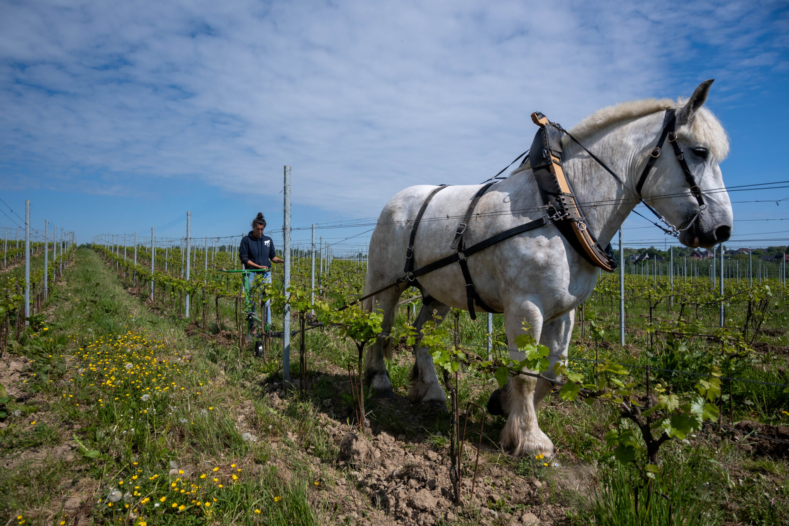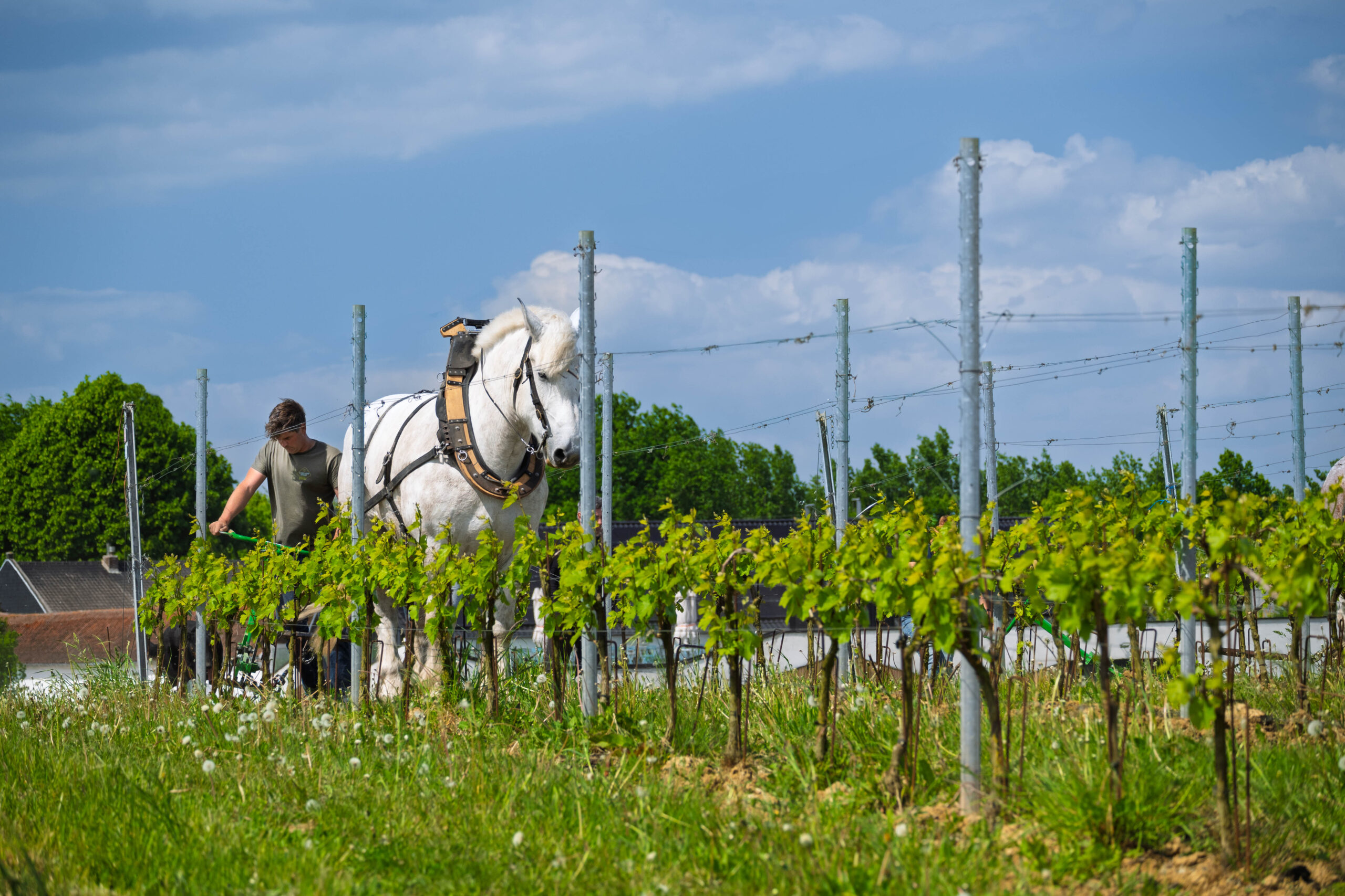 Met paarden werken we precies tussen de wijnranken, ook in smalle rijen en op hellingen. Taken zoals aanaarden, afaarden, schoffelen en cultiveren voeren we zorgvuldig uit, zonder schade aan de planten en met respect voor de bodemstructuur. Deze aanpak houdt de bodem luchtig, beperkt erosie en geeft biodiversiteit meer ruimte. Zo zorgen we voor gezonde wijnstokken en een veerkrachtige wijngaard.