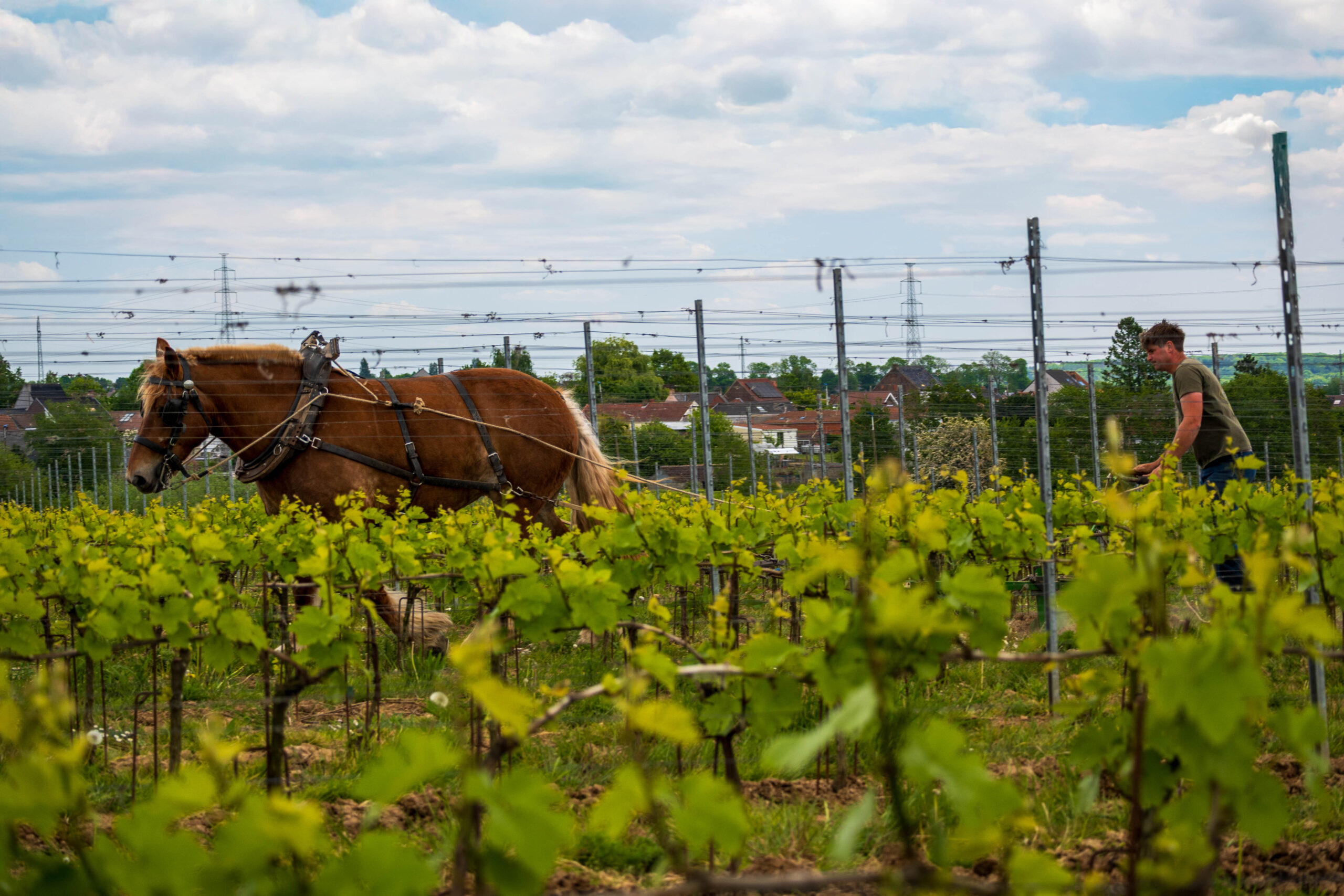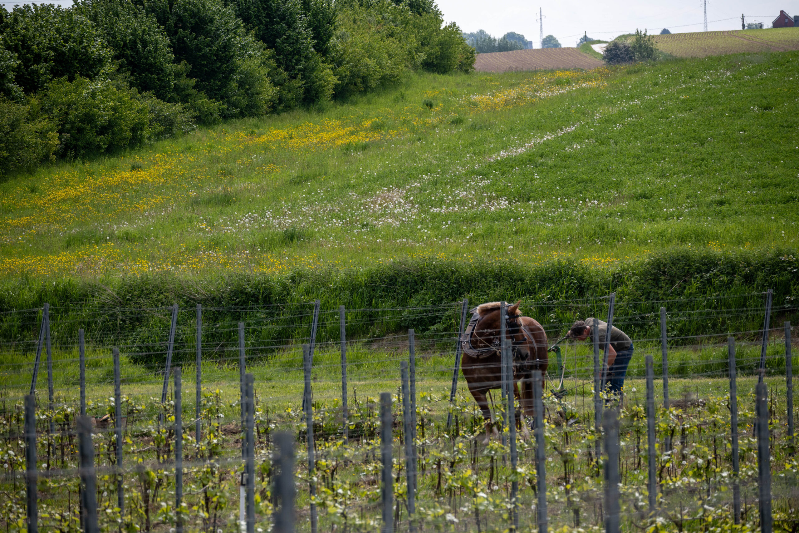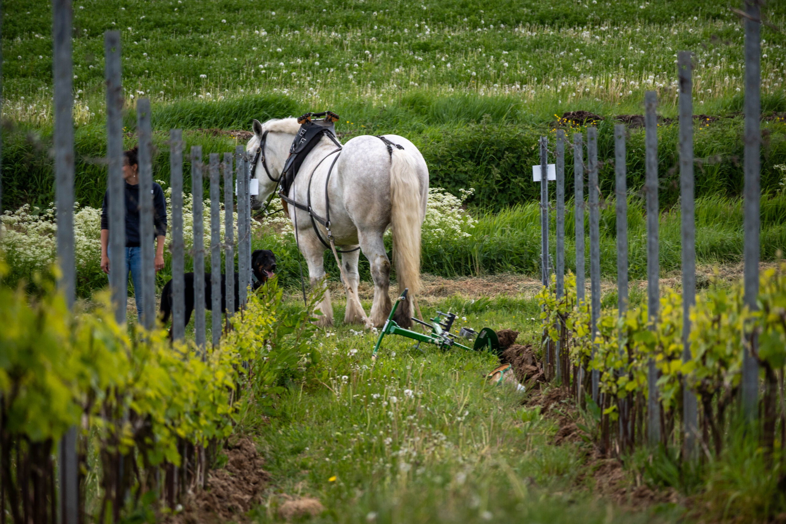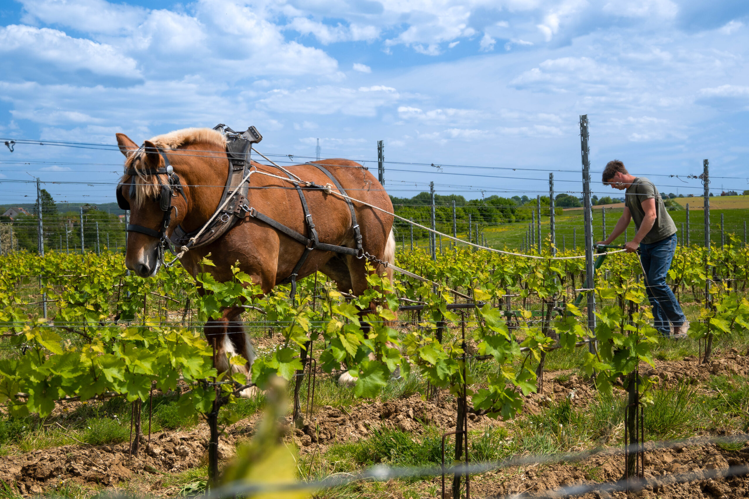 Met paarden werken we precies tussen de wijnranken, ook in smalle rijen en op hellingen. Taken zoals aanaarden, afaarden, schoffelen en cultiveren voeren we zorgvuldig uit, zonder schade aan de planten en met respect voor de bodemstructuur. Deze aanpak houdt de bodem luchtig, beperkt erosie en geeft biodiversiteit meer ruimte. Zo zorgen we voor gezonde wijnstokken en een veerkrachtige wijngaard.